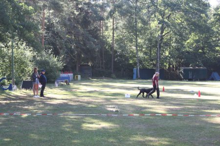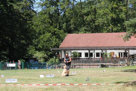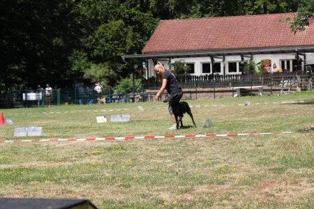 Darauf folgt die Leistungsklasse 1 mit neun Startern. Auch hier geht Yvonne für unseren Verein an den Start, diesmal mit ihrem zweiten Hund Peggy. Bei dieser Prüfung steht die Aufregung ein wenig zwischen den beiden, aber auch hier eine sehr gute Leistung, die mit 83 Punkten bewertet wird.
