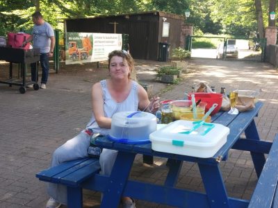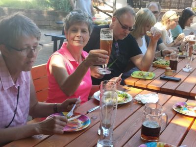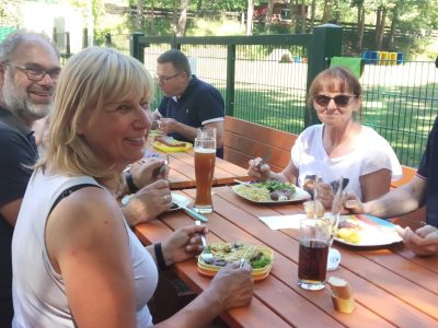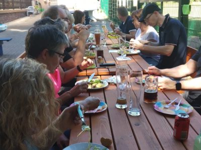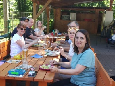 Zu Fleisch, Wurst und Frikadelle wurden zahlreiche selbstgemachte Salate gereicht, als Nachtisch gab es Schokokuchen und Heidelbeermuffins. Die Bewirtung mit kalten Getränken übernahm Gilbert von unserer Vereinsgaststätte. So verging ein schöner Tag mit kurzweiligen Gesprächen und viel Spaß. Die Wiederholungsgefahr ist vorprogrammiert!